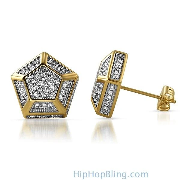3D Pentagon Gold CZ Bling Bling Earrings
