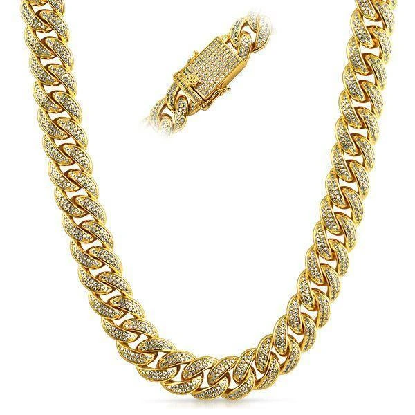 Full Bling Bling Cuban Chain with CZ Diamond Clasp. Made with .925 Sterling Silver Material wrapped with 18K Gold. This Bling Bling Chain looks like a Quarter Million on your neck. This Massive Hip Hop Cuban Chain is totally covered in bling from top to bottom. Each and every stone is prong set, the same way as real diamonds are set. Each and every link and even the clasp is covered in the finest Simulated Diamonds. The shine on this Gold Bling Bling Cuban Chain is incredible. The Cuban Chain is Thick 18K Gold wrapped to look and feel like solid gold and stay shining. Order your gold Iced Out Cuban Chain today and shine right up there with the top rappers in the game!