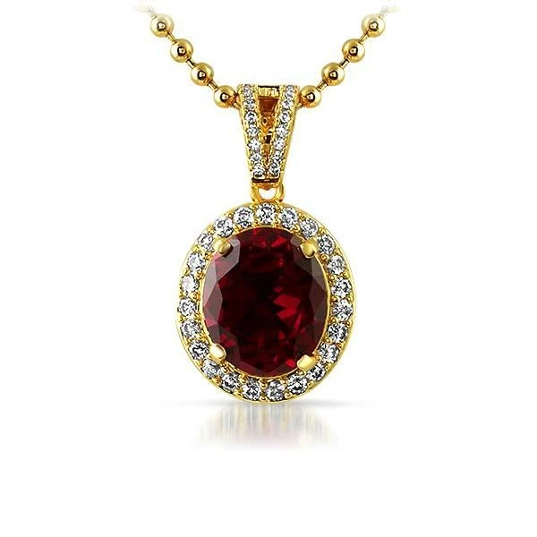 Lab Made Ruby Hip Hop Gem Pendant. Made from real .925 Sterling Silver and 10x 14K gold dipped to look like solid gold and stay gold. Incredibly detailed with filigree siding and pattern caged back. The oval cut stone is set in securely by prongs and it is surrounded by AAA simulated diamonds micro pave hand set by a skilled jeweler. We now made this very popular hip hop gem pendant in solid .925 Sterling Silver for those who must wear the real metals. Order yours today and shine like all the celebrities, rappers, and millionaires out there!