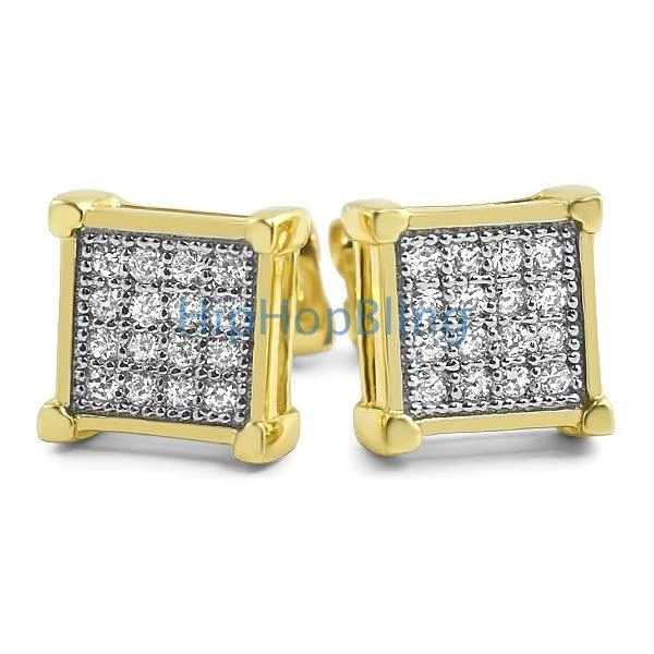 Box CZ Micro Pave Gold Bling Bling Earrings. Get the maximum bling bling shine with these iced out earrings. Quality crafted with intricate details. Stones are VVS Simulated Diamonds which are Prong Set and designed to perfection. Ice up your ears with these amazing hip hop earrings. Order your Hip Hop Bling Earrings today.