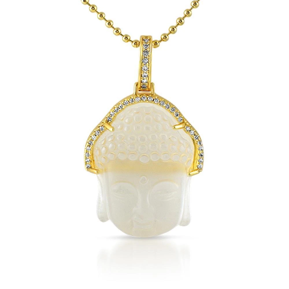 Carved Frosted Crystal Buddha Pendant Gold CZ Hair Outline. This iced out simulated diamond pendant shines bright. Each stone is set with prongs, no glue! Elevate your swag and stand out from the crowd with this unique bling bling pendant around your neck. Get the bustdown look and feel of a real diamond hip hop pendant for a fraction of the cost. Quality finish and craftsmanship that is made to last. Shine better and order today.