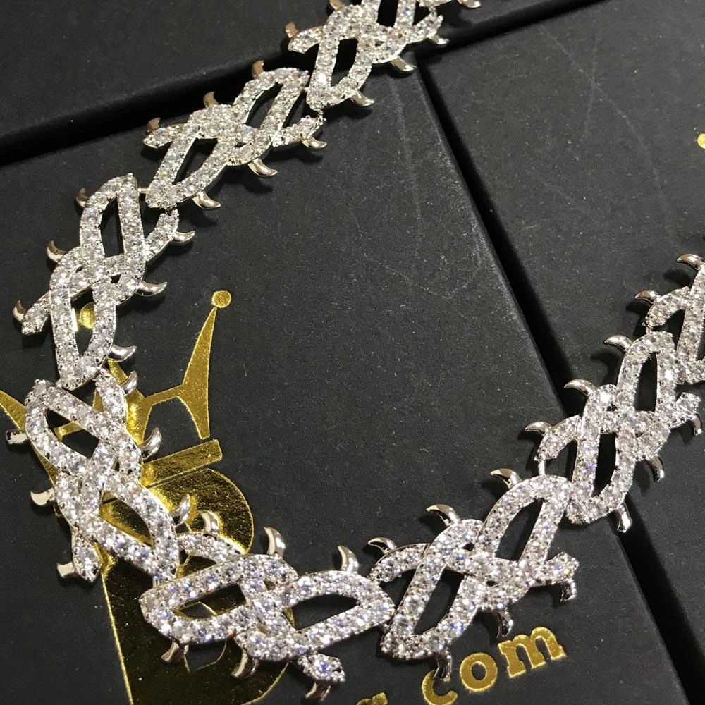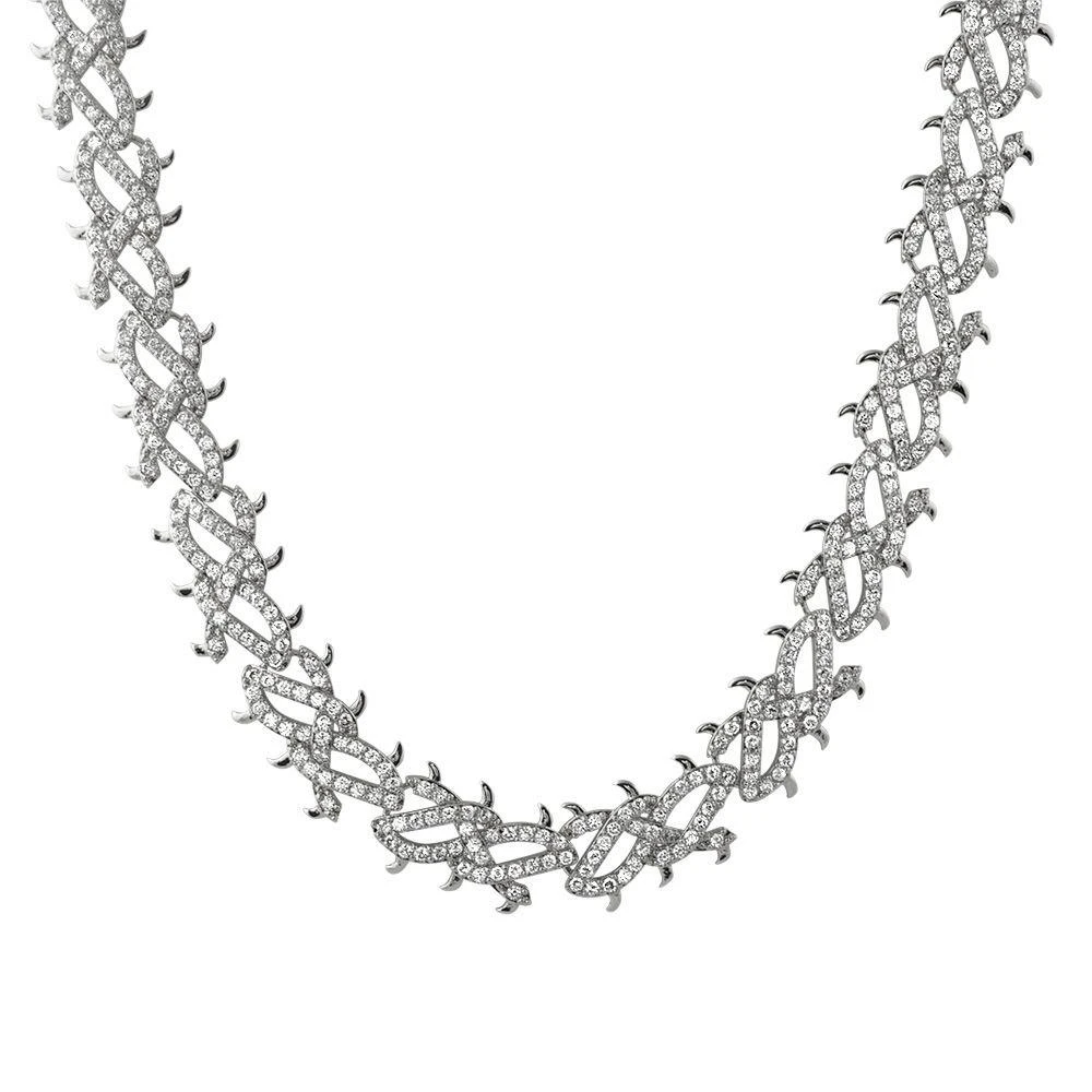 Uniquely crafted “Crown of Thorns” design Bling Bling Chain. Modeled after the Crown of thorns on Jesus. Highly detailed with sharp details. All stones are VVS Simulated diamonds that are prong set. This Hip Hop Chain is sure to turn heads. Measures 15MM Wide from thorn to thorn. White Gold Plated to look like Platinum at a fraction of the cost. Get yours and Order today.