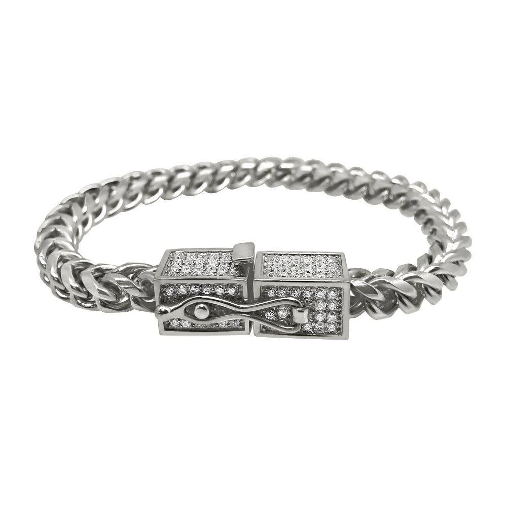 CZ Box Clasp Triple Lock Gold Steel Franco Chain Necklace. A hip hop jewelry classic with added bling bling. You can wear this with anything it is so versatile. Made from Solid Stainless Steel and IP Gold plated so you know it will stay shining. Stones are Prong Set with VVS Simulated Diamonds. Choose from 4MM and 6MM Wide Franco Hip Hop Chains.