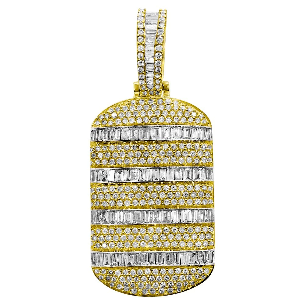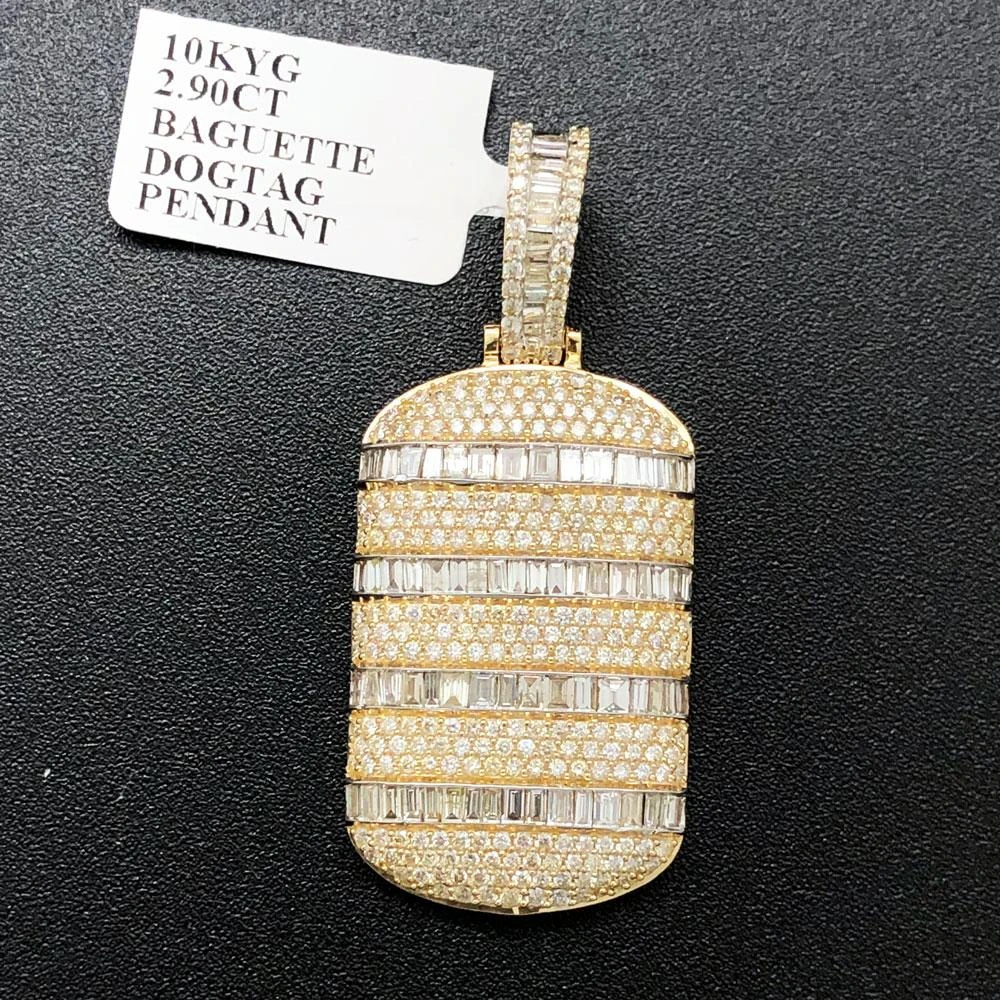 Dog Tag Baguette Diamond Pendant 2.90cttw 10K Yellow Gold with Solid Back. Solid 10K Yellow Gold with Round Cut and Baguette Cut Genuine Diamonds hand set. Intricate details with precision micro pave prong setting. Real bling bling diamond pendant iced out. All Real Diamond Hip Hop Jewelry with nice details and quality at an affordable price.