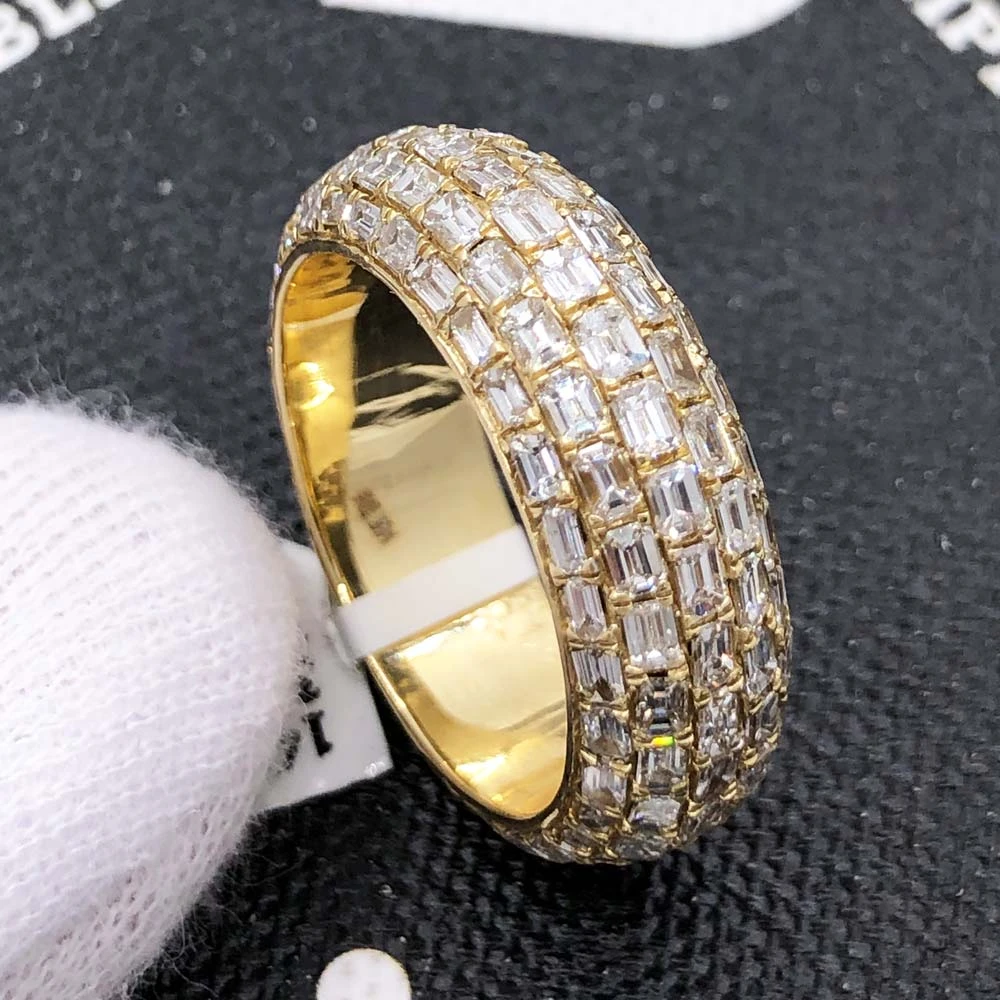 Domed Emerald Cut Eternity Band Diamond Ring 3.46cttw 14K Yellow Gold. Quality crafted Diamond ring iced out with a bling bling shine. Custom Designer looking Mens Bling Bling Ring. Precision detailed prong Diamond Setting on this Diamond iced out ring. Beautiful big and bold look. Popular style Hip Hop Bling Bling Ring is crafted with 14K Yellow Gold and Genuine Natural Diamonds.