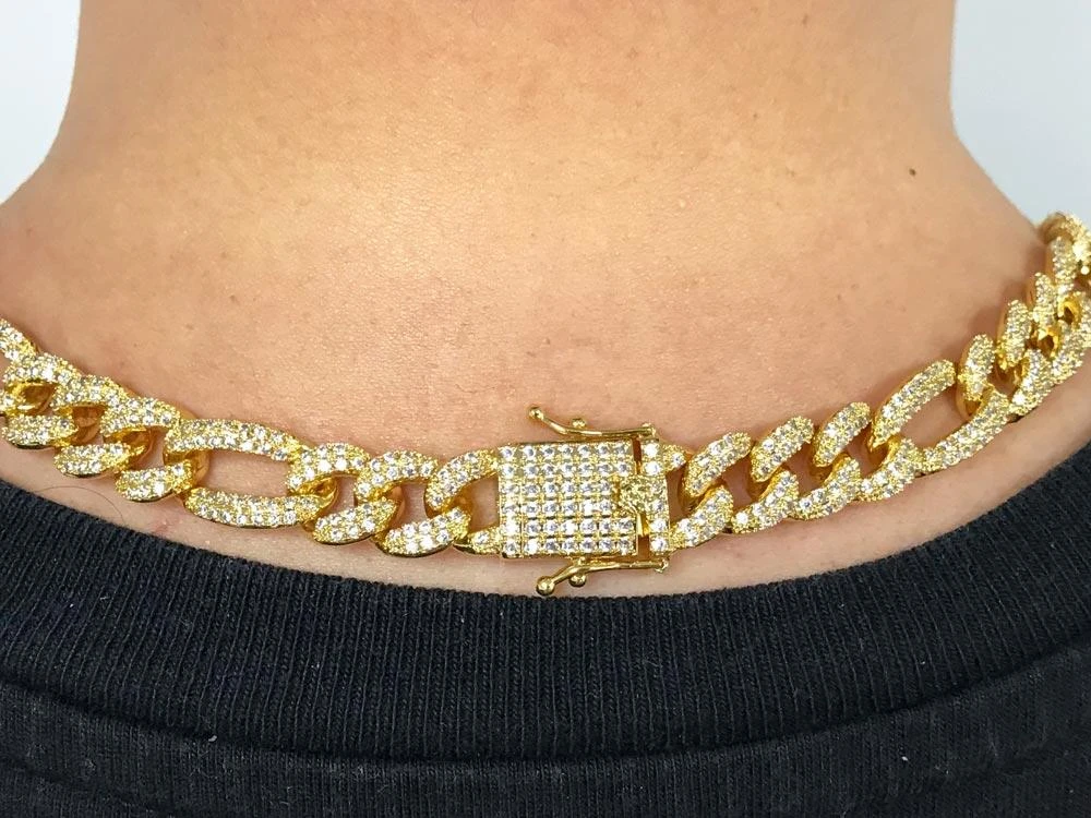 HIPHOPBLING Figaro Bling Bling Chain 11MM Wide. Timeless Classic Iced Out Figaro Chain with a Big and Bold Bling Bling Shine. Highly detailed with intricate details and stone setting. All stones are VVS Simulated Diamonds that are prong set. HIPHOPBLING offers the Best in Hip Hop Jewelry Since 2003.