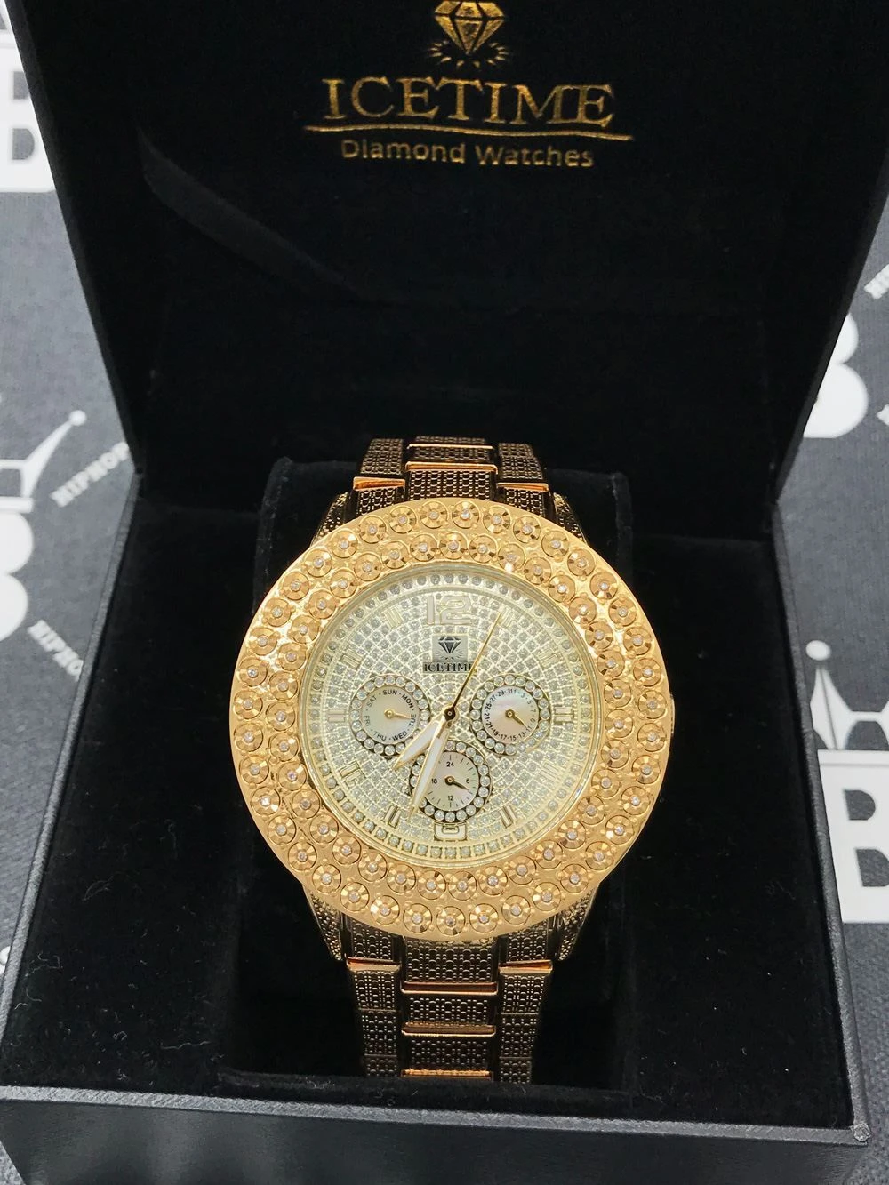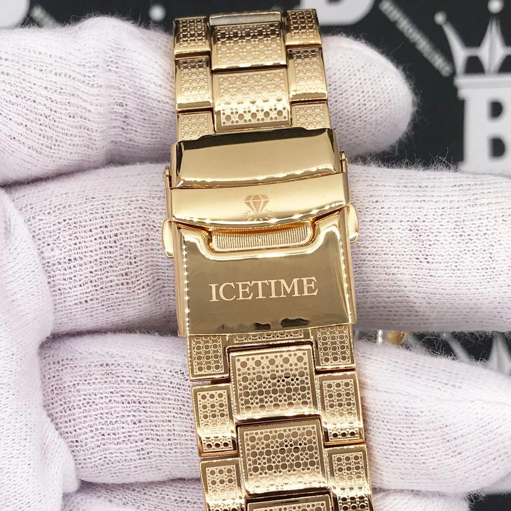 Ice Time Genuine Diamond Watch. Heavyweight Stainless Steel Watch with .50 Carat Double Diamond bezel. The illusion setting makes it look like a 10 carat diamond bezel. For a very low price you can have this beautiful Hip Hop Diamond watch on your wrist.