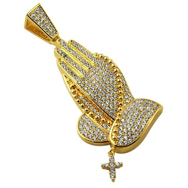 Praying Hands Bling Bling Pendant with Dangling Cross. Micro Pave CZ simulated diamonds prong set for maximum shine and real look. 18K Gold wrapped plated for a brilliant long lasting and realistic Gold Shine. Great details and solid feeling hip hop prayer hands pendant.