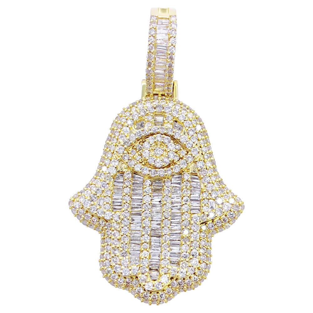 Hamsa Hand Baguette 1.88cttw Diamond Pendant 10K Gold. Solid 10K Yellow Gold or 10K White Gold with Round Cut and Baguette Genuine Diamonds hand set. Intricate details with precision micro pave prong setting. Real bling bling diamond pendant iced out. All Real Diamond Hip Hop Jewelry with nice details and quality at an affordable price.