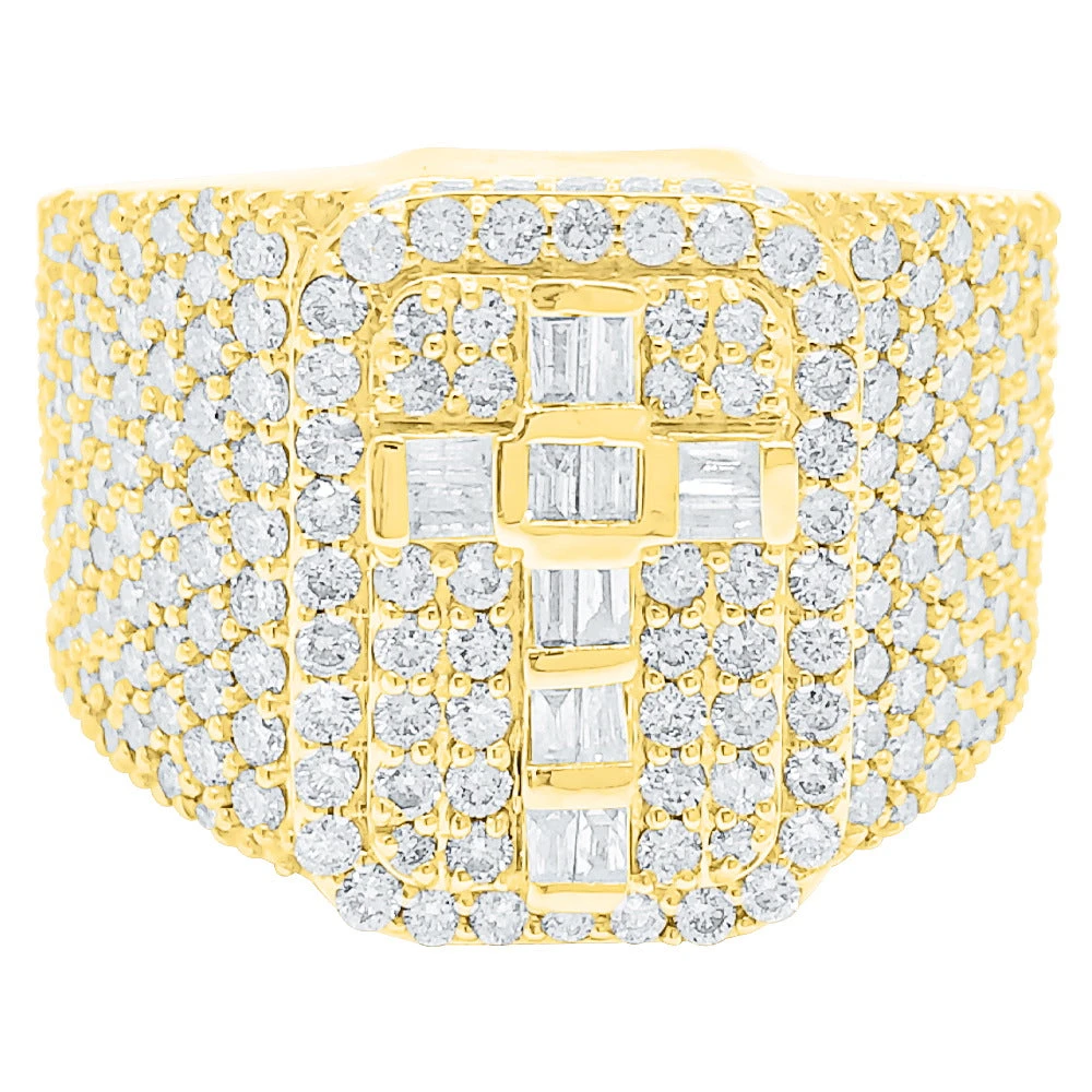 Large Baguette Cross Diamond Ring 3.90cttw 10K Gold. Quality crafted Diamond ring iced out with a bling bling shine.  Custom Designer looking Mens Bling Bling Ring. Precision detailed prong Diamond Setting on this Diamond iced out ring. Beautiful big and bold look. Popular style Hip Hop Bling Bling Ring is crafted with 10K Yellow Gold or 10K White Gold and Genuine Natural Diamonds.