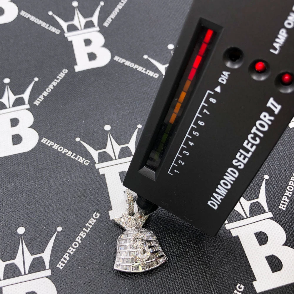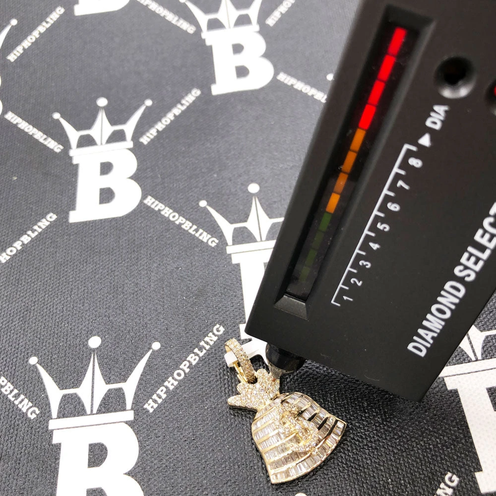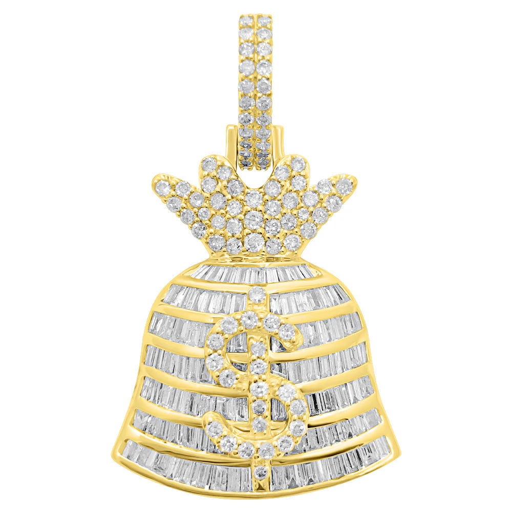 Money Bag 2.55cttw Baguette Diamond Pendant 10K Gold. Solid 10K White or Yellow Gold with Round Cut and Baguette Cut Genuine Diamonds hand set. Intricate details with precision micro pave prong setting. Real bling bling diamond pendant iced out. All Real Diamond Hip Hop Jewelry with nice details and quality at an affordable price.