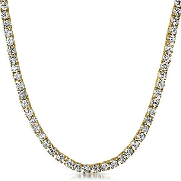 Popular bling bling tennis Chain. Quality Prong Set CZ Gold 1 Row Bling Bling Tennis Chain. 4MM CZ Simulated Diamonds Prong Set. 14K Gold Wrapped Thick, about 10x the industry average. Looks real and made to last.