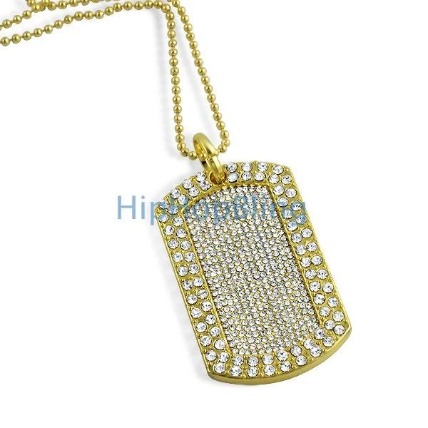 Gold bling bling dog tag with 300 stones. Major bling bling shine on this hip hop dog tag.  Comes with a 2MM 36″ bead chain that can be cut down to a shorter length. One of the best selling hip hop jewelry pieces of all time.