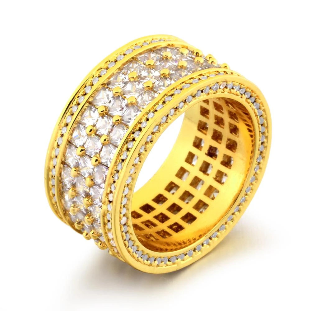 Triple Row Princess Cut Eternity Band Gold Mens CZ Bling Ring