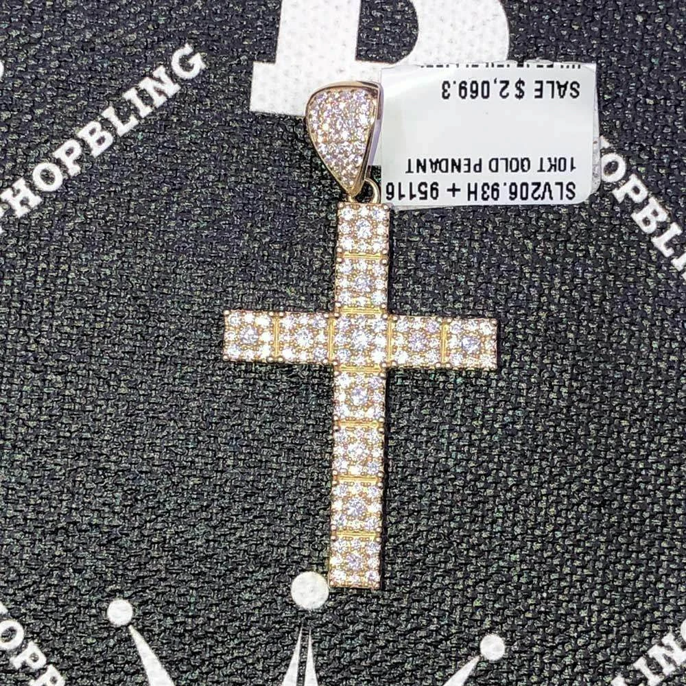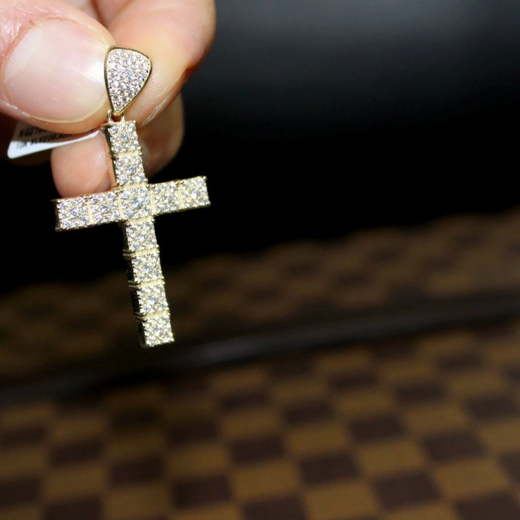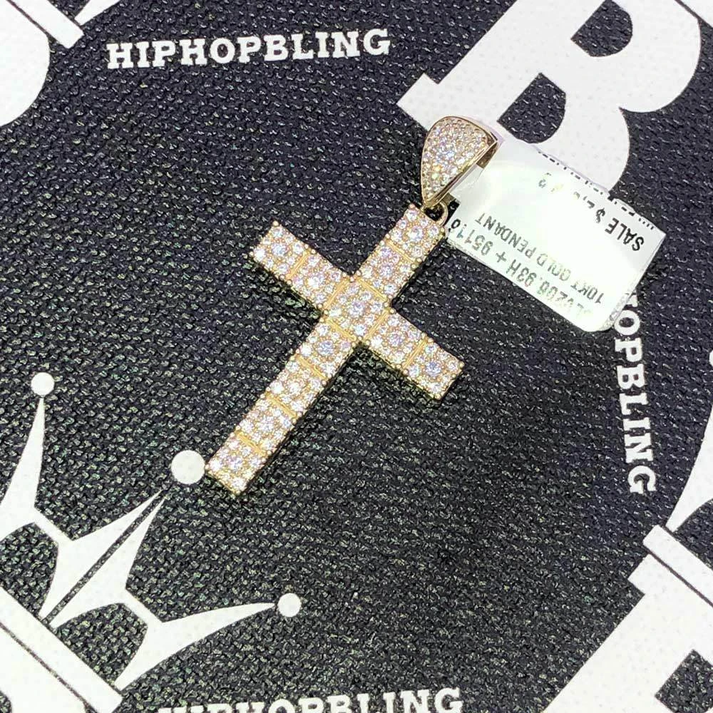 VVS CZ 10K Yellow Gold Mini Block Tennis Cross Pendant. Made out of Real Solid 10K Yellow Gold with Simulated VVS Stones. Real 10K Gold and Simulated Diamonds are the best value because you get the genuine precious metal that doesn’t tarnish and has melt value. Combined with stones that look identical to VVS diamonds but cost next to nothing when comparing price. Maximize your value and buying power saving thousands of dollars for the near identical look with this bling bling 10K Yellow Gold Hip Hop Cross.